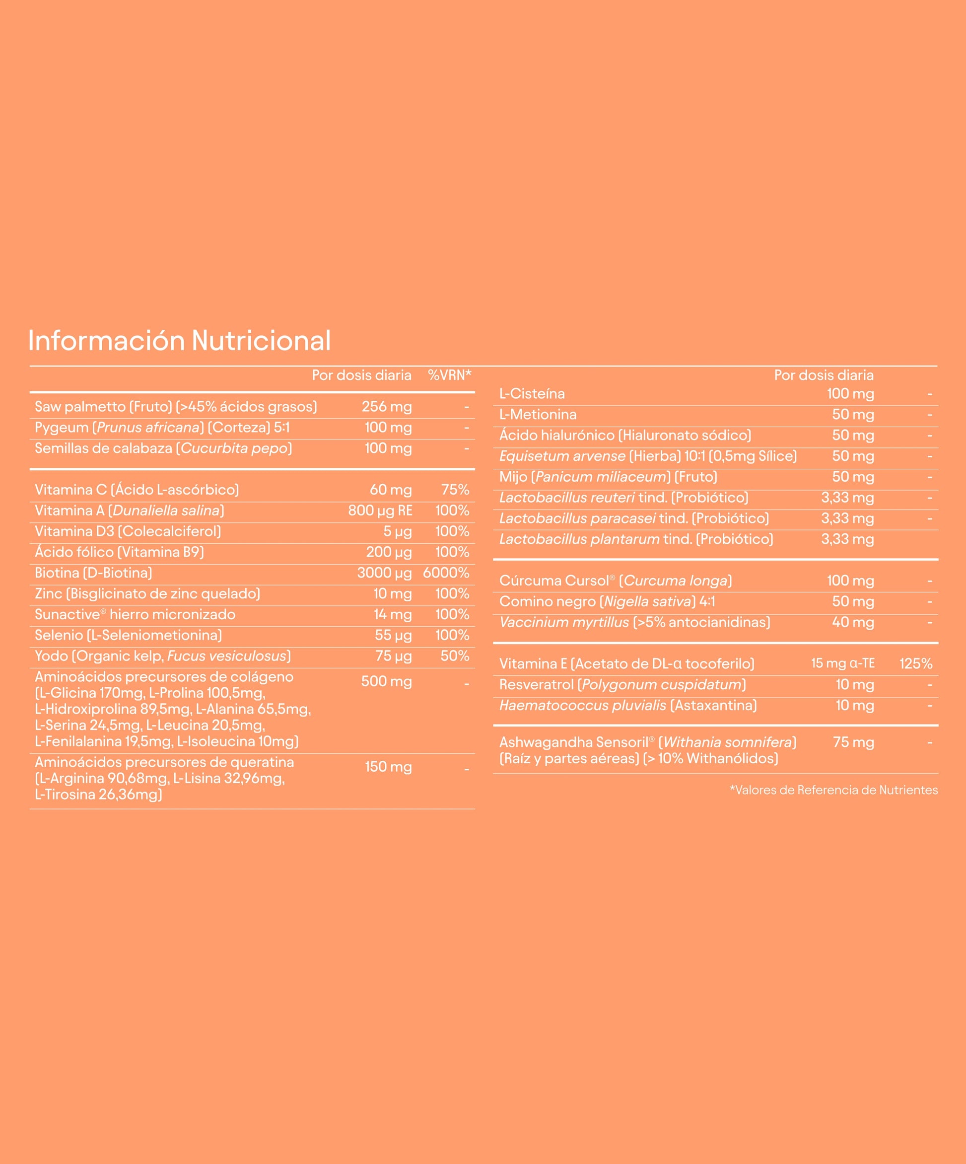 Su diferencial está en sus blends exclusivos: 5-alfa reductasa avanzada, acción única sobre el eje estrés–inflamación–salud intestinal, aminoácidos biomiméticos de colágeno y queratina, y un potente complejo antioxidante anti hair aging. Máxima absorción y resultados visibles.