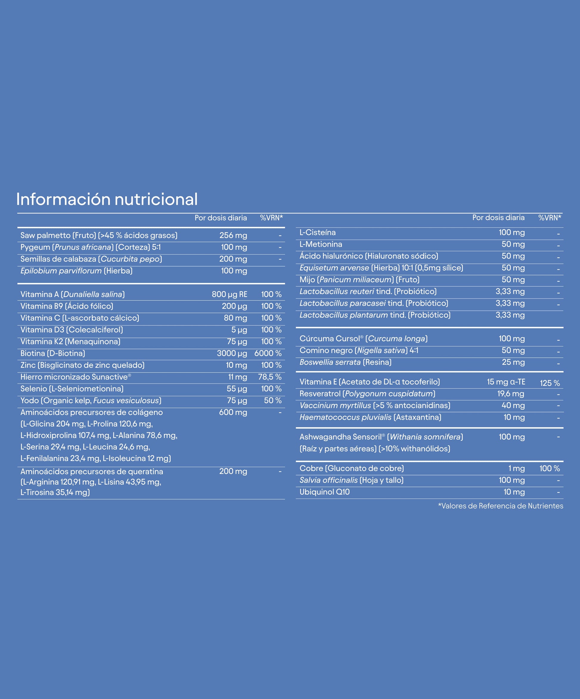 Su diferencial está en sus blends exclusivos: 5-alfa reductasa avanzada, acción única sobre el eje estrés–inflamación–salud intestinal, aminoácidos biomiméticos de colágeno y queratina, y un potente complejo antioxidante anti hair aging. Máxima absorción y resultados visibles.